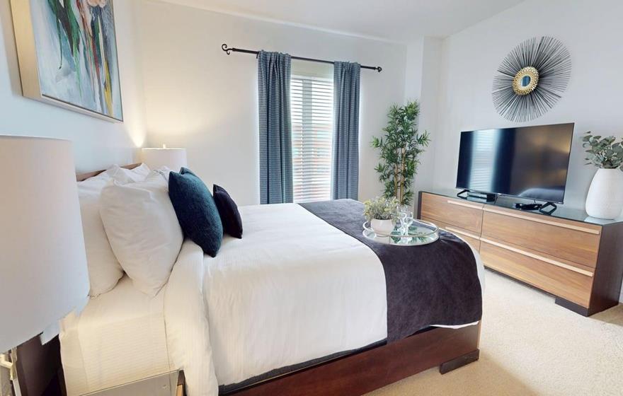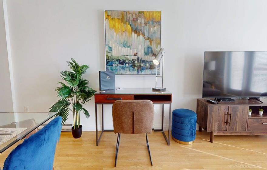 Tous les séjours de 30 nuits et plus incluent : services publics inclus, logement entièrement meublé, Wi-Fi, câble et appels locaux, buanderie dans l’unité, entretien ménager aux deux semaines, vaisselle, serviettes et literie, ainsi qu’un service aux invités 24 h/24, 7 j/7.