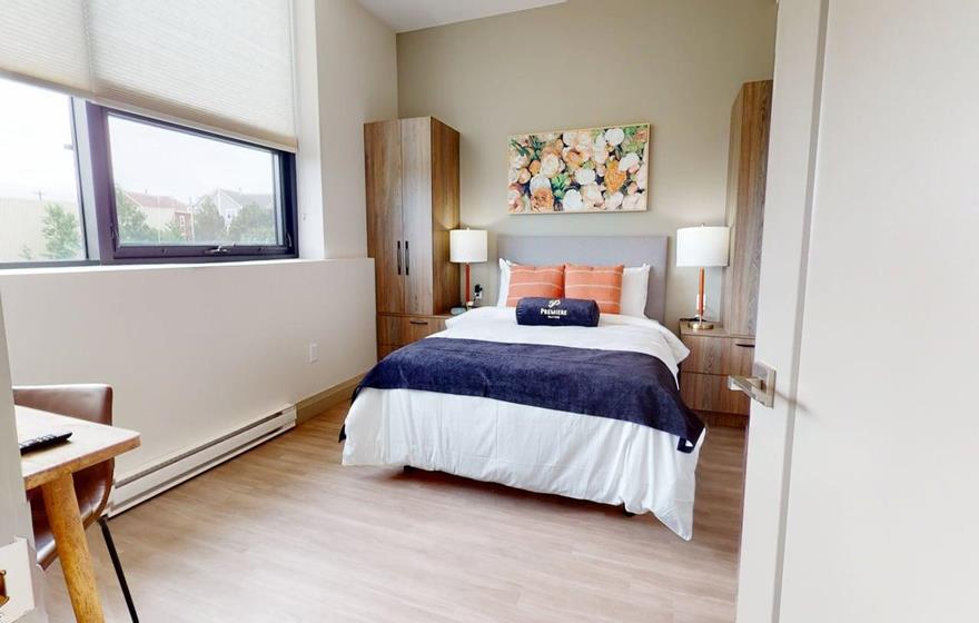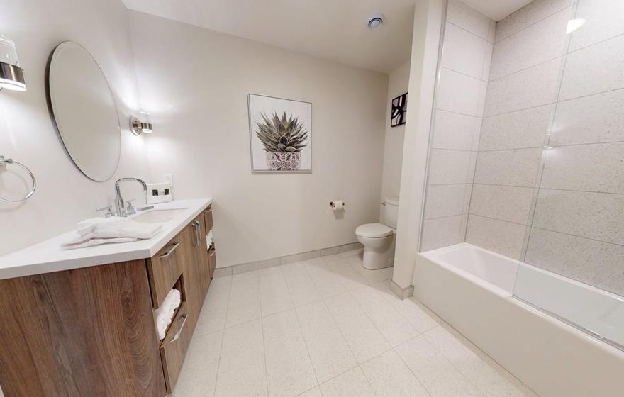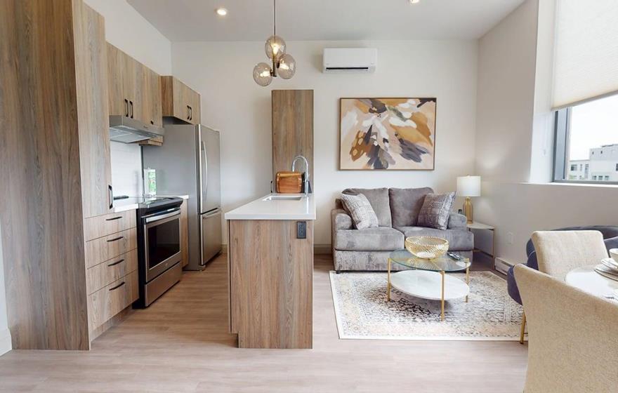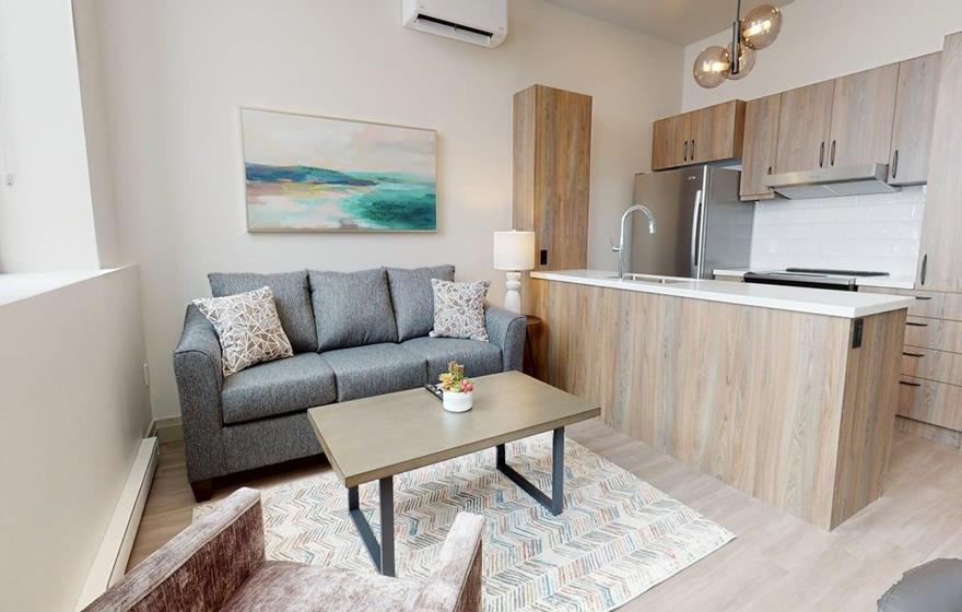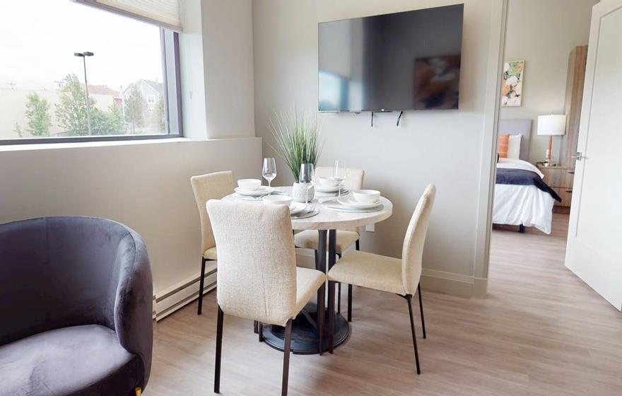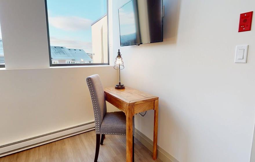 These bright and contemporary one- and two-bedroom suites range from 550 to 1,000 sq. ft. and feature large windows, high ceilings, and built-in cabinetry. Each suite is thoughtfully designed with modern kitchens, sleek bathrooms, in-suite climate control with air conditioning, and dedicated workspaces, making them ideal for extended stays.