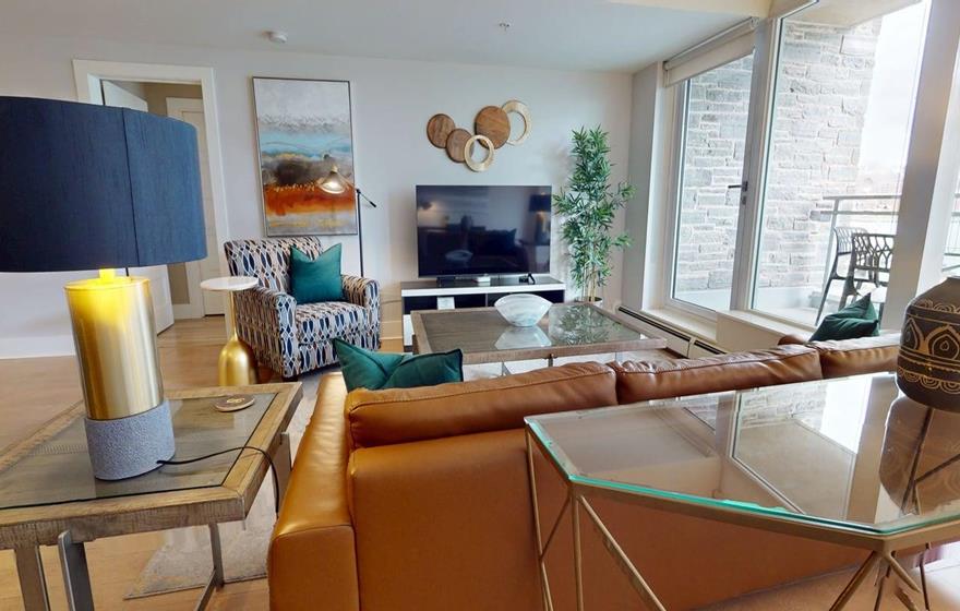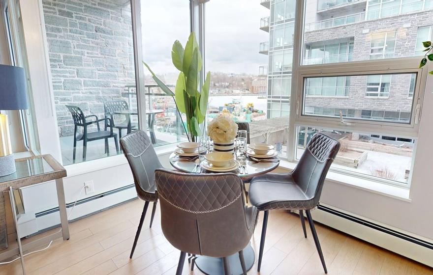 This spacious one-bedroom furnished apartment offers breathtaking, iconic views of Halifax Harbour. The open-concept layout features a modern kitchen with an island for added prep space, flowing into a comfortable living area with seating and TV. A dining area with water views opens onto a private balcony, while a dedicated workspace makes it ideal for professionals seeking short-term rentals in Dartmouth or Halifax.