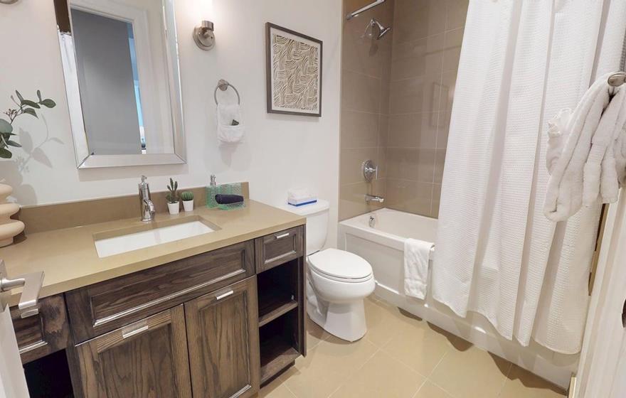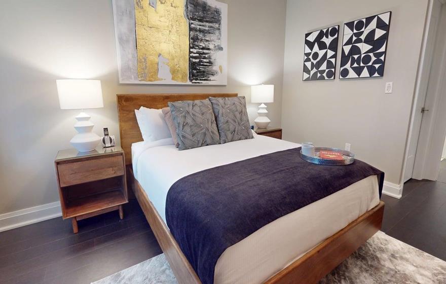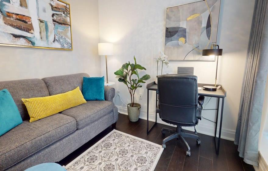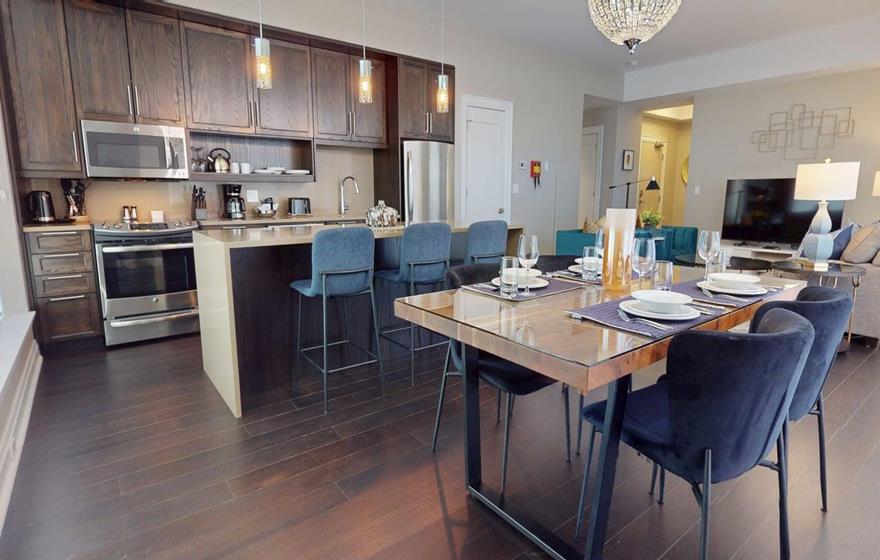 This one-bedroom plus den executive suite is ideal for short-term rentals in Dartmouth near Halifax. The open-concept layout features a fully equipped modern kitchen with a large island and seating, flowing into the dining area and comfortable living space. The bedroom includes a queen bed and a separate three-piece bathroom, while the private den offers a pull-out sofa, dedicated workspace, and added flexibility for guests or remote work.