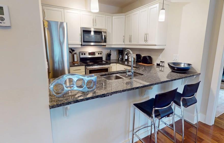 These spacious two-bedroom furnished apartments are ideal for executive short-term rentals in Dartmouth or corporate housing near Halifax. Offering nearly 1,300 sq. ft. of living space, each suite features an open-concept gourmet kitchen with granite countertops, stainless steel Bosch appliances, and a breakfast bar with dining area overlooking the water. The living space opens to a private balcony with harbour views. Both bedrooms include queen-sized beds and large windows, with the primary bedroom offering an ensuite bathroom. In-suite laundry ensures added convenience throughout your stay.