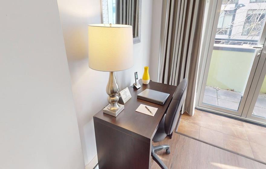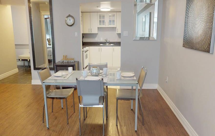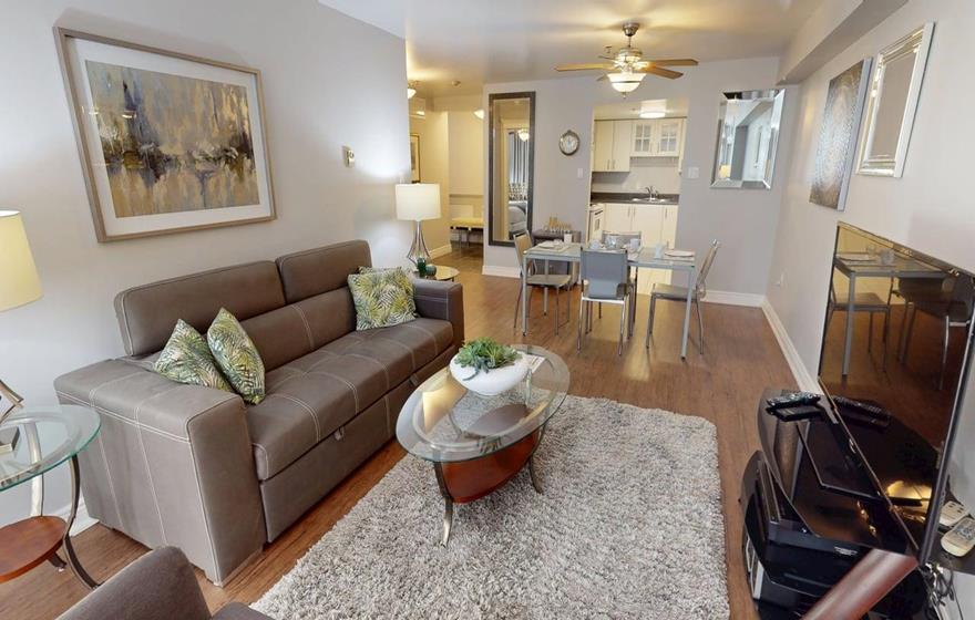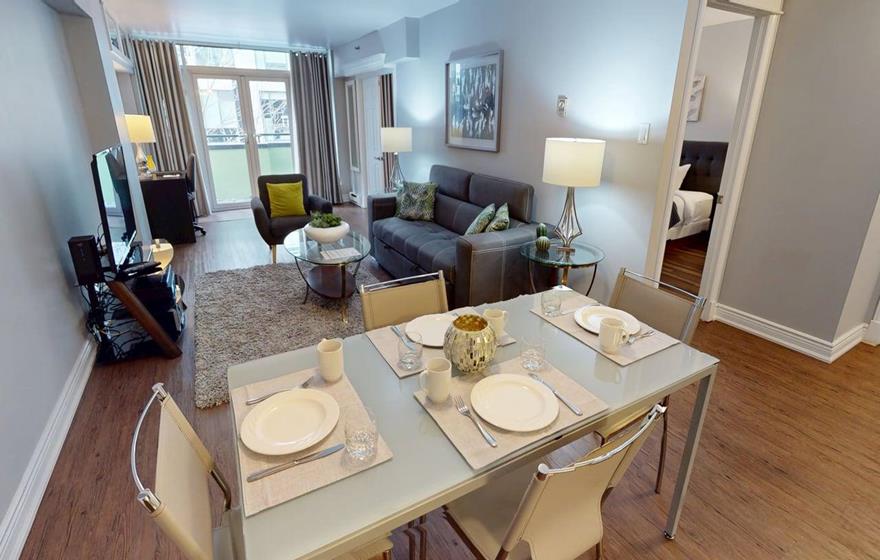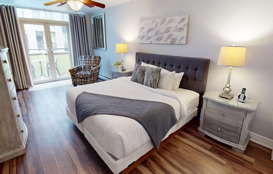 Welcome to The Greystones, offering a one-bedroom, one-bathroom apartment in the heart of Halifax’s vibrant South End. This building provides the perfect solution for corporate housing or short-term rentals in Halifax, combining contemporary design with convenience and comfort. This fully furnished one-bedroom apartment is designed for effortless living. The open-concept kitchen flows into a separate dining area with hardwood floors, while the living room opens to a dedicated workspace with a private balcony. The spacious bedroom features a queen bed and also provides access to the balcony, creating a bright and airy retreat for work or relaxation.